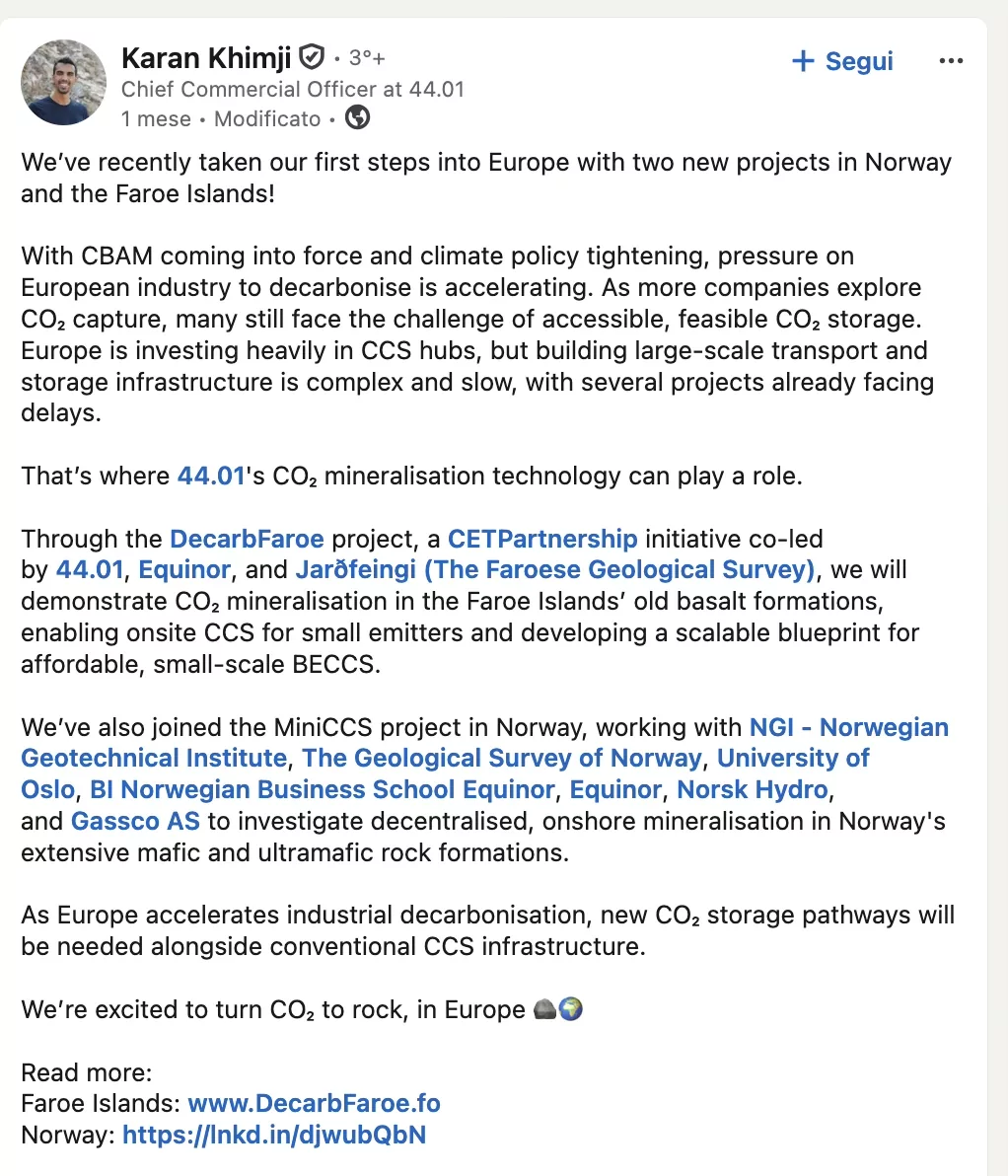 Negli ultimi mesi 44.01 ha annunciato i suoi primi passi nel continente europeo con due nuovi progetti: MiniCCS in Norvegia, avviato nel febbraio 2026, e DecarbFaroe nelle Isole Faroe, annunciato a marzo 2026. Il primo esplora la possibilità di uno stoccaggio onshore decentralizzato e su piccola scala nelle rocce mafiche e ultramafiche norvegesi. Il secondo, co-guidato con Equinor e Jarðfeingi, userà antiche formazioni di basalto nelle Faroe per testare la mineralizzazione come soluzione di CCS locale e distribuita. In entrambi i casi il messaggio è chiaro: 44.01 non vuole restare la startup “del deserto omanita”. Vuole capire se il modello può adattarsi ad altri contesti geologici, industriali e regolatori.