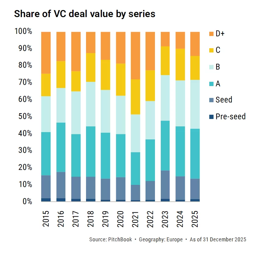 The venture capital landscape in Europe saw a growing divergence between different ecosystems and sectors during 2025. The value of European deals grew in 2025, while the number of transactions continued to decline. Activity was driven by fewer but larger late-stage funding rounds. At the sector level, it is clear that AI has caused the main bifurcation in market trading areas.