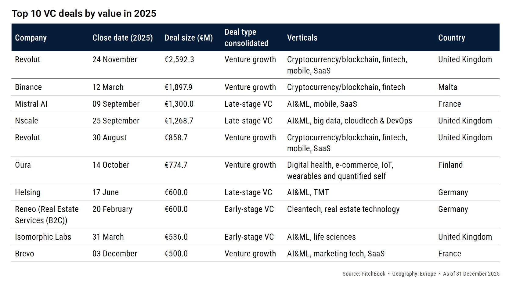 The picture was also mixed in terms of the different investment stages: both the seed stage and Series C recorded the most significant declines in value on an annual basis, with double-digit declines, while the later stages, from Series D onwards, recorded the largest increase, with a 45.2% rise thanks to growth in average investment values. In the fourth quarter of 2025, in particular, the most significant transactions included a megadeal by Revolut and Ōura’s €775 million round in October, a rare position for a purely consumer company, especially one not linked to artificial intelligence. Similarly, a foodtech startup also made an appearance in the top 10 deals of the quarter: German online grocery store Picnic’s €430 million round followed other popular sectors such as artificial intelligence startup Brevo. Revolut’s €2.6 billion round, which closed in November and involved a secondary sale of shares, proved to be the largest deal of the year. Overall, in 2025, the largest deals after Revolut included artificial intelligence companies Mistral AI and Nsale, both of which raised more than €1 billion in a single round.