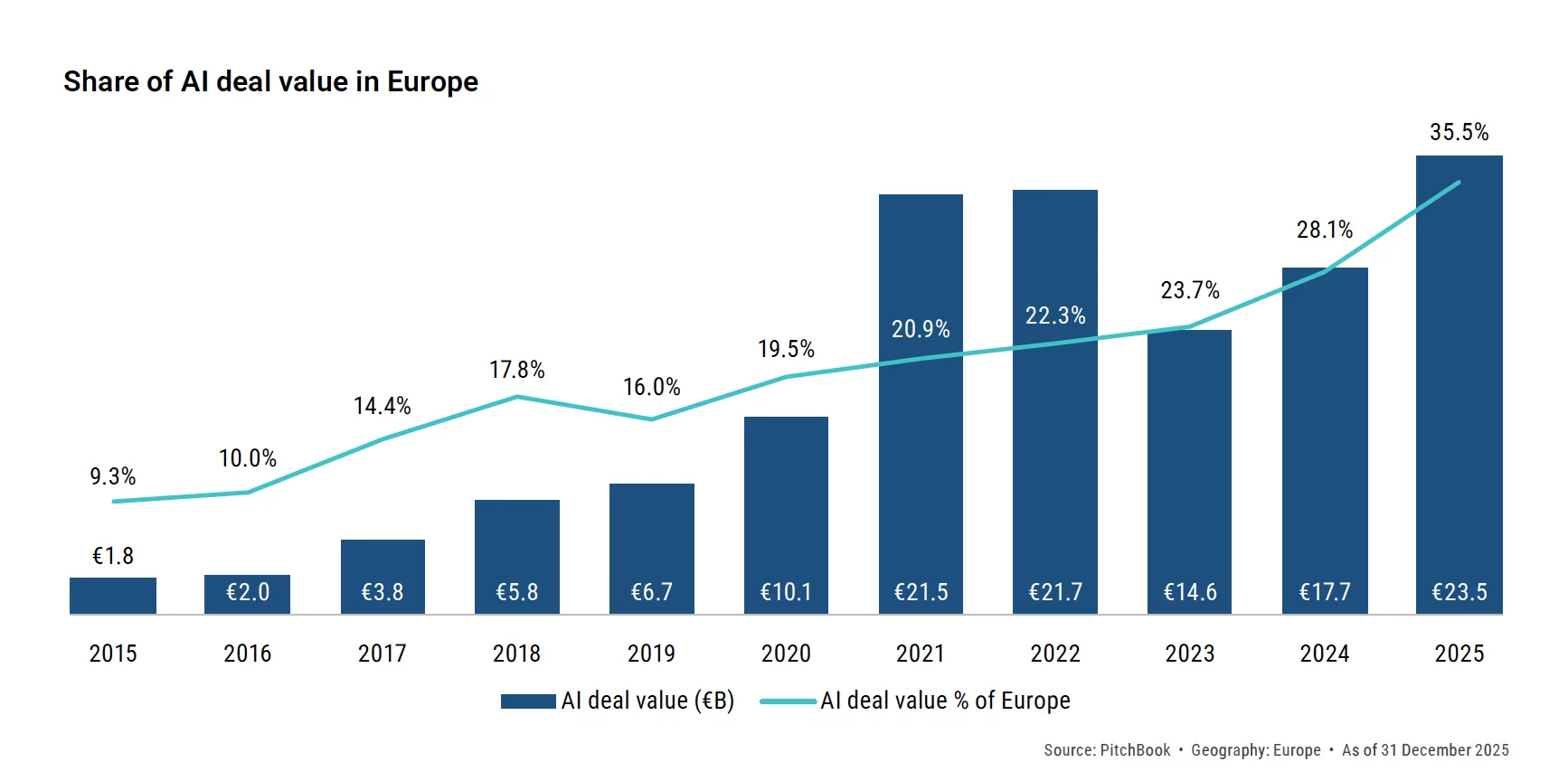 What would European venture capital be without artificial intelligence? In 2025, artificial intelligence was the dominant force in venture capital markets. In Europe, one-third of transactions during the year involved AI companies, with 35.5% of the value of European transactions concentrated in this sector. In absolute terms, this led to €23.5 billion in investment in the sector, surpassing the historical peaks of investment in the sector in 2021-2022, when market conditions and macroeconomic factors were very different from those of today. The rate of investment in this sector is therefore evidence of the level of demand that the vertical has demonstrated. The value of transactions grew by 32.6% in an environment where financing conditions are difficult and non-AI-related verticals are being excluded.