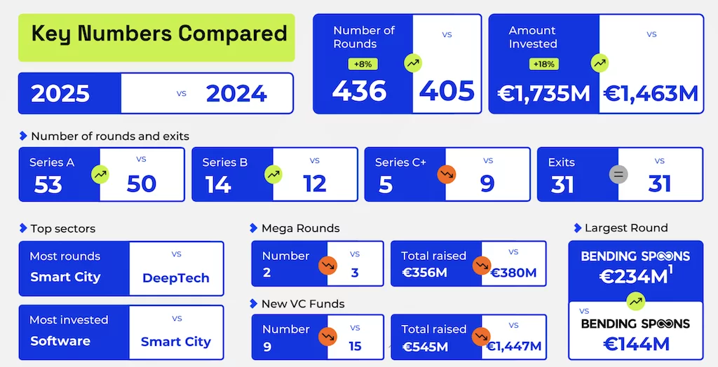 Among the top five deals of 2025, Bending Spoons (234 million Growth VC) ranks first, followed by AAvantgarde (122 million Series B), Exein (100 million Series C), NanoPhoria (83.5 million Series A), and Exein (70 million Series C).