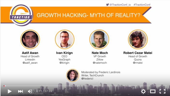 Often misunderstood, growth hacking is NOT about magically achieving hockey-stick growth by using short-term hacks. It’s about continuously trying to find scalable and repeatable ways to grow using the power of people, data, technology, marketing and creativity. Our panelists discuss the art and science of building a sustainable growth engine. Featuring Aatif Awan, Head of Growth, LinkedIn; Ivan Kirign, CEO, YesGraph (former Growth at Dropbox); Nate Moch, VP Growth, Zillow; and Robert Cezar Matei, Head of Growth, Quora. Moderated by Frederic Lardinois, TechCrunch. Traction Conf Vancouver 2015 -http://tractionconf.io